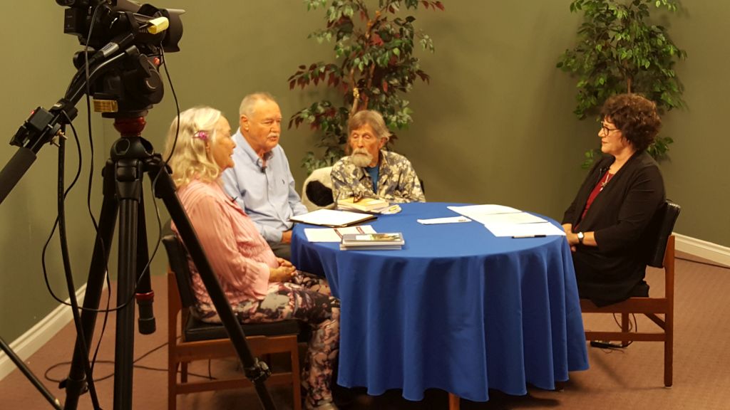 Shooting began January 19 on an ambitious series of three 9-minute videos about the three Village writing clubs (Writers Club, Publishing Club, and Spoken Word Club) to be produced by Video One member and Spoken Word president Charlie Redner. The three videos will be used independently for club promotion and also combined into a half-hour show for Village Television, says Charlie. Presidents of the three clubs (from left) – Peggy Edwards, founder and president of the Publishing Club, Charlie, and Richard Snyder of the Writers Club– were interviewed by Video One member Bonnie Beaux Fullerton in the Video Studio as part of Video One’s January 19 meeting.