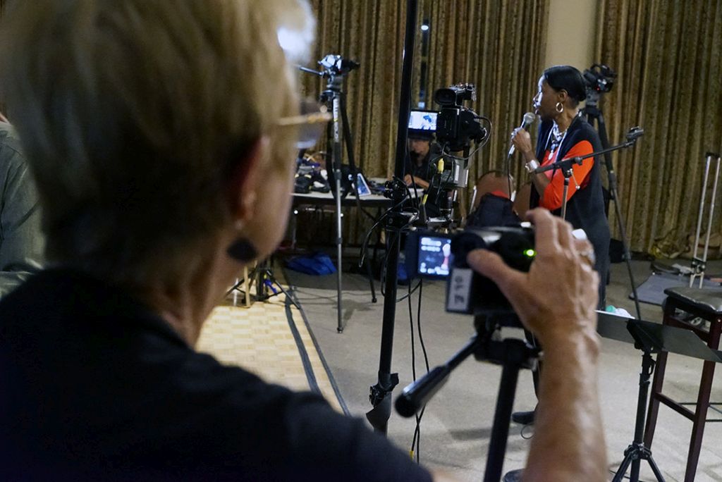 Several ambitious remote shoots highlighted April for the Video One production team, along with a trip on April 20 to Chapman University’s Dodge College of Film & Media Arts, organized by Dr. Jeanne Mayer with help from Leon Goldberg, where a group of Video Club members observeded student TV news broadcasting in action and enjoyed a gourmet luncheon in the student food court. (See photos below by Lucy Parker.)