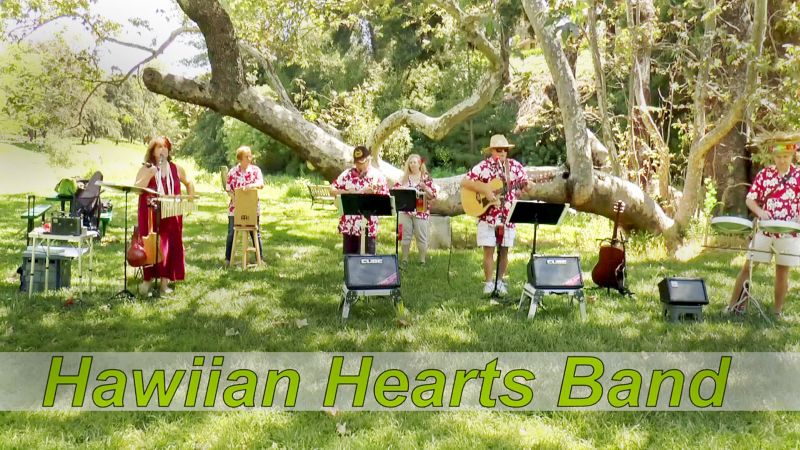 The concerts have also been captured in a half-hour stand-alone Video Club video shot by Tom Nash, Jack Crawbuck, and Jim Rohrs, and edited by Tom. Five groups – both residents and guests – appear in the video, including a six-member Hawaiian band (above). The video is expected to air during July, says Tom. Air times TBA.