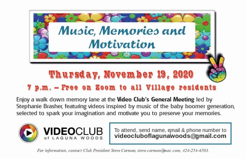Put your feet up, dim the lights, and log on to the Video Club’s General Meeting on Thursday, November 19, at 7 pm for a relaxing walk down memory lane. The program will feature a variety of videos inspired by music from the baby boom generation, selected to spark your imagination and encourage you to preserve your history and memories. At the meeting, Video Club Board Member and instructor, Stephanie Brasher, will be announcing “The Video Club Challenge.” To attend, send your name, email, and phone number to videocluboflagunawoods@gmail.com and request a link. There will be no General Meeting in December.