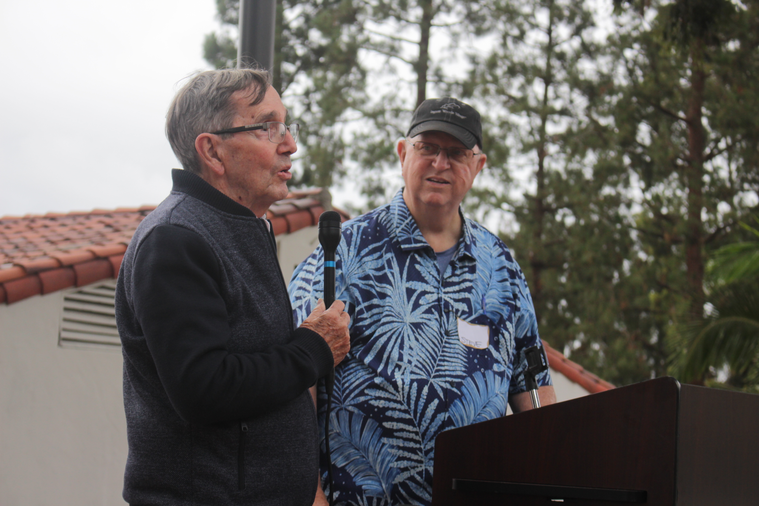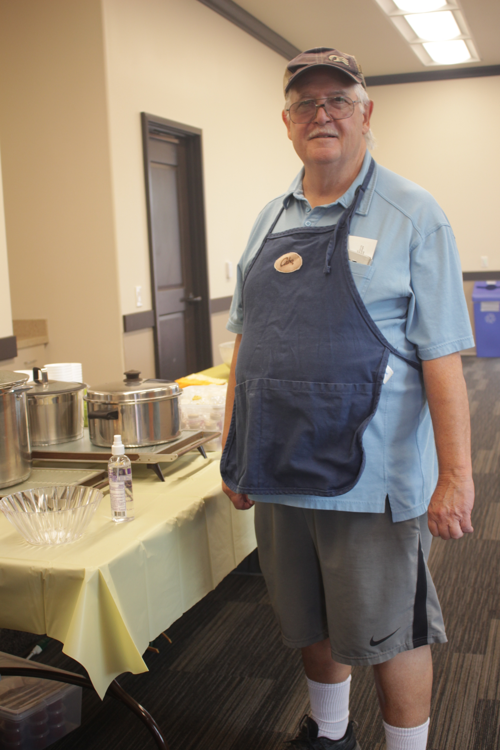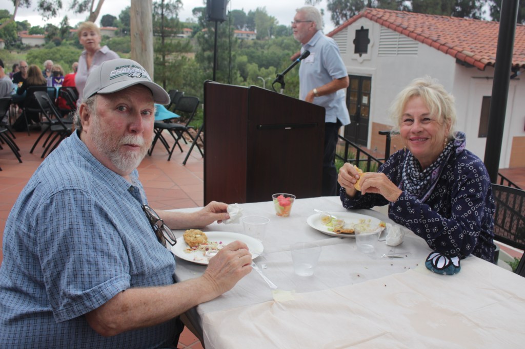 Chefs Jim Rohrs and Chris Carman, son of President Steve and Joan Carman, grilled beef and veggie burgers and franks. Club volunteers Jack Crawbuck, Lucy Parker, Joan Carman, and guest Joan Milliman served baked beans, potato salad, coleslaw, cookies, and fruit, with Marsha handing out burgers and franks at the head of the line. Starkey welcomed arriving guests at the registration table. Stephanie Brasher showed the three winning videos in the Video Lab before the dinner to those who had not yet seen them. Tom Nash set up sound for the program.