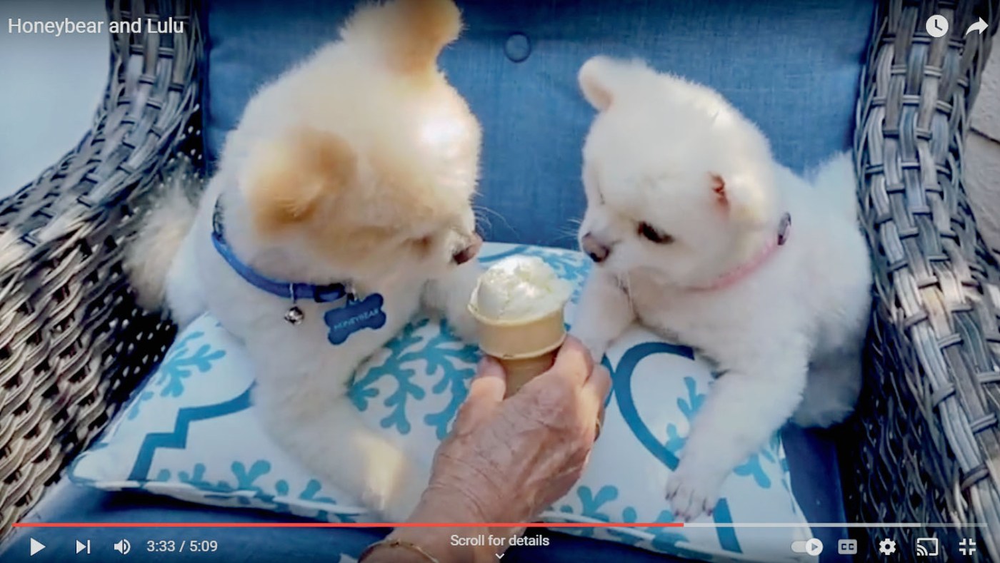 Honeybear, a 12-year-old rescue dog, was lonely with no canine companion, so eight months ago, his owner brought eight-year-old Lulu home from the OC Pom Rescue service to keep him company. The two got on so well together, according to Stephanie, who edited the video, that their owner decided to hold a wedding for them “as a fun reason to get neighbors together.” Ice cream and lemonade were served, the owner performed the ceremony, and comedian Joey Sims of the Laguna Woods Village Komedy Klub sang a song.