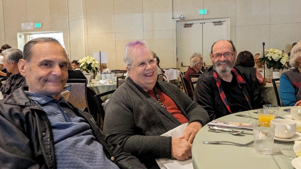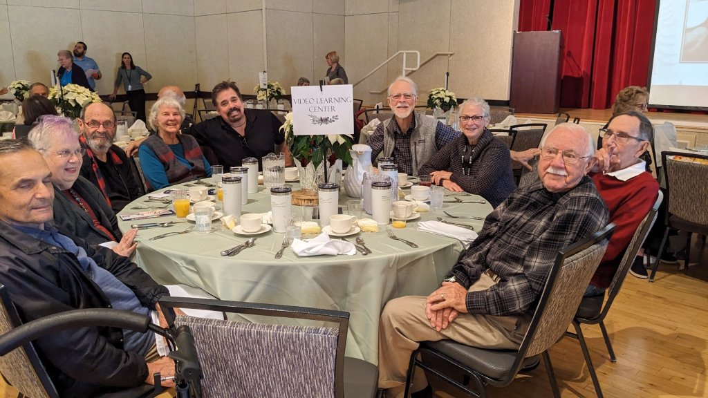 Ten Video Club volunteers were among over 500 hard-working residents honored at Laguna Woods Village’s annual Volunteer Appreciation Luncheon in Clubhouse 5 on December 1. (From left) Herve Rialle, Suzanne Savlov, John Kelly, Lili Green, Jack Crawbuck, Ward Cushman, Marsha Berman, Tom Nash, and Wolfgang Kutter. The tenth was Lucy Parker, who took the photo. Martinez Caterers outdid themselves with both the speed of the service and quality of the food (roast beef, salmon, chicken and all the trimmings).