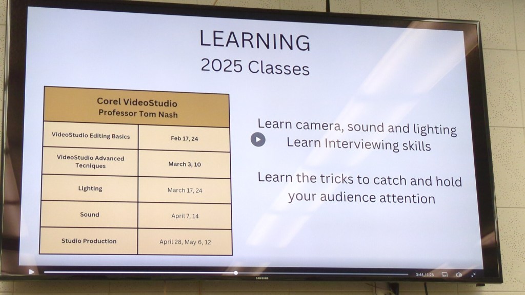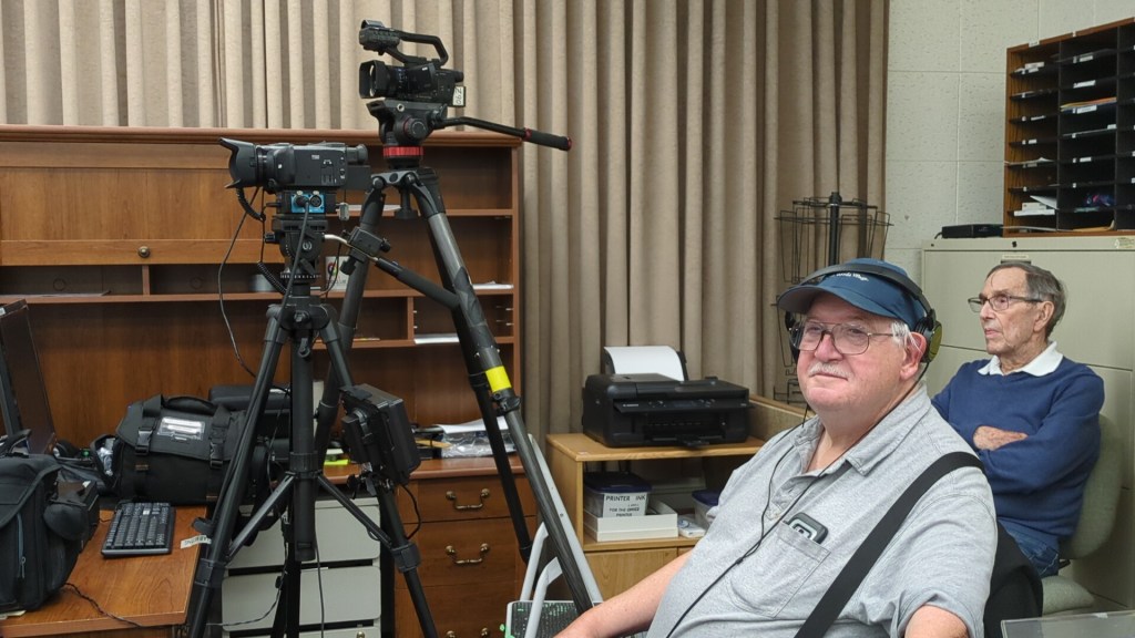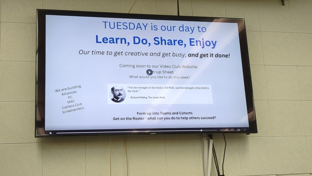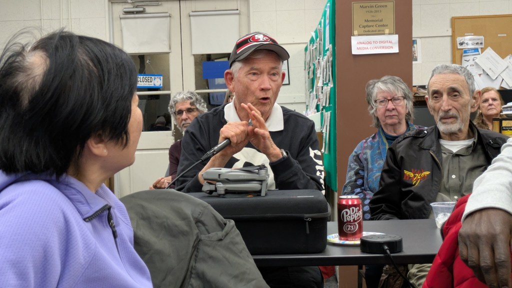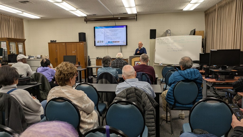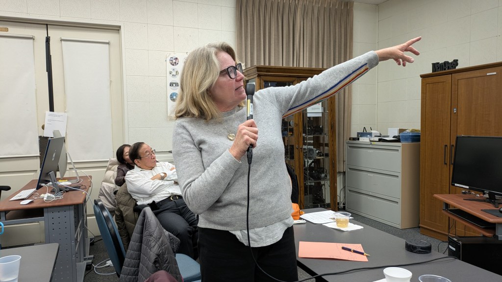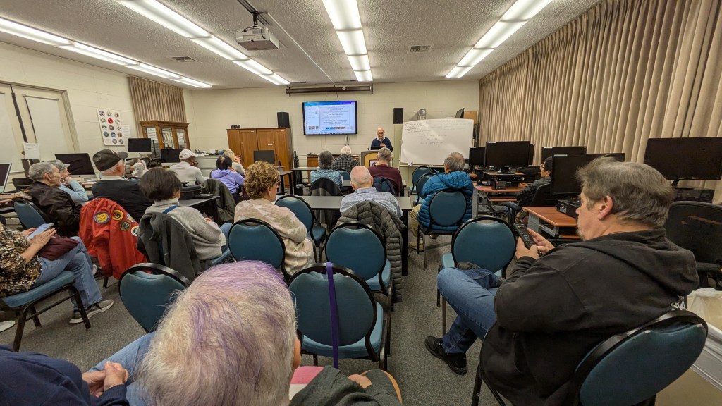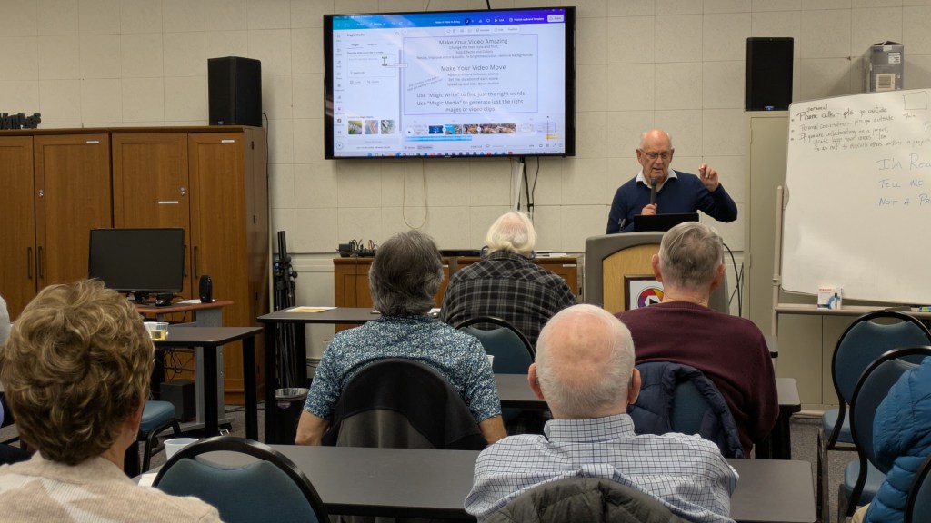 Here’s a potpourri of scenes as members reacted to 2025 club plans unveiled by President Jonathan Williams at the club’s first General Meeting of 2025 on January 15 in the Video Lab. Equipment Manager Jim Rohrs (below, right) video-recorded the meeting — soon to be available on the club’s YouTube channel.