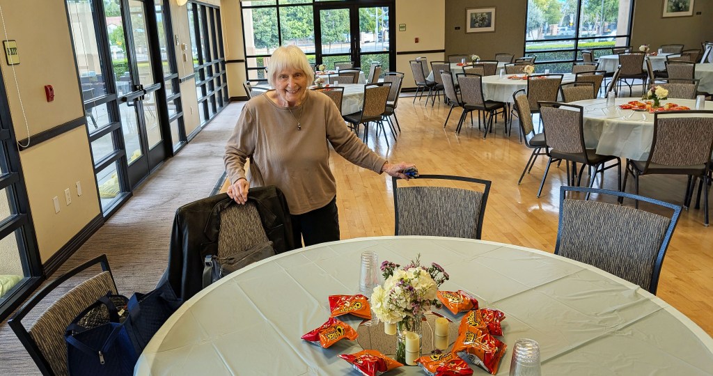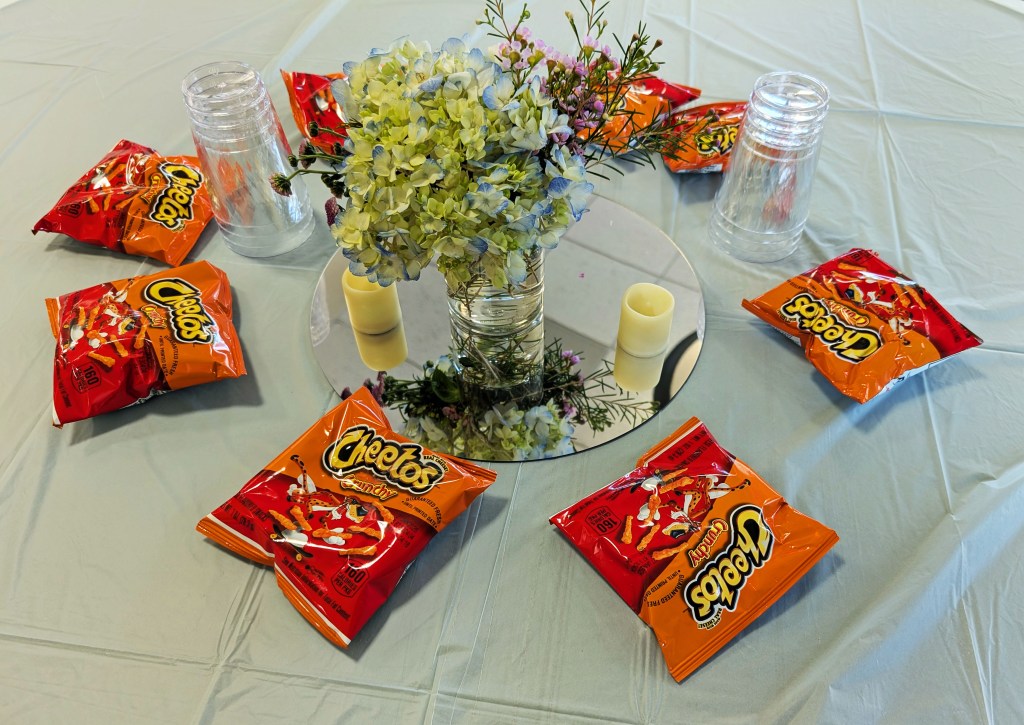 The refreshments included some 20 bottles of wine found in Tom’s manor after his passing. Tom rarely drank, but, it turns out, he kept wine on hand for his friends. The collection was served at the Tribute, with unopened bottles distributed to guests. Also found in Tom’s manor were numerous bags of Cheetos, one of Tom’s favorite snacks. In recognition, Cheetos graced every table for the guests to enjoy — along with a delicious afternoon menu of coffee and pastries.