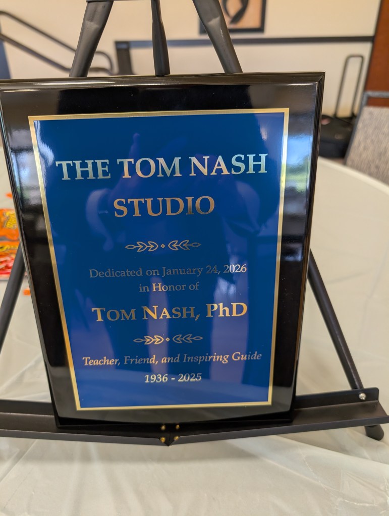 Re-naming the Video Studio as “The Tom Nash Studio” highlighted a gala event for over 100 friends from Laguna Woods Village and beyond on Saturday afternoon, January 24, 2026, in Clubhouse 7, held in honor of beloved club leader, Dr. Tom Nash, who died on October 27, 2025.