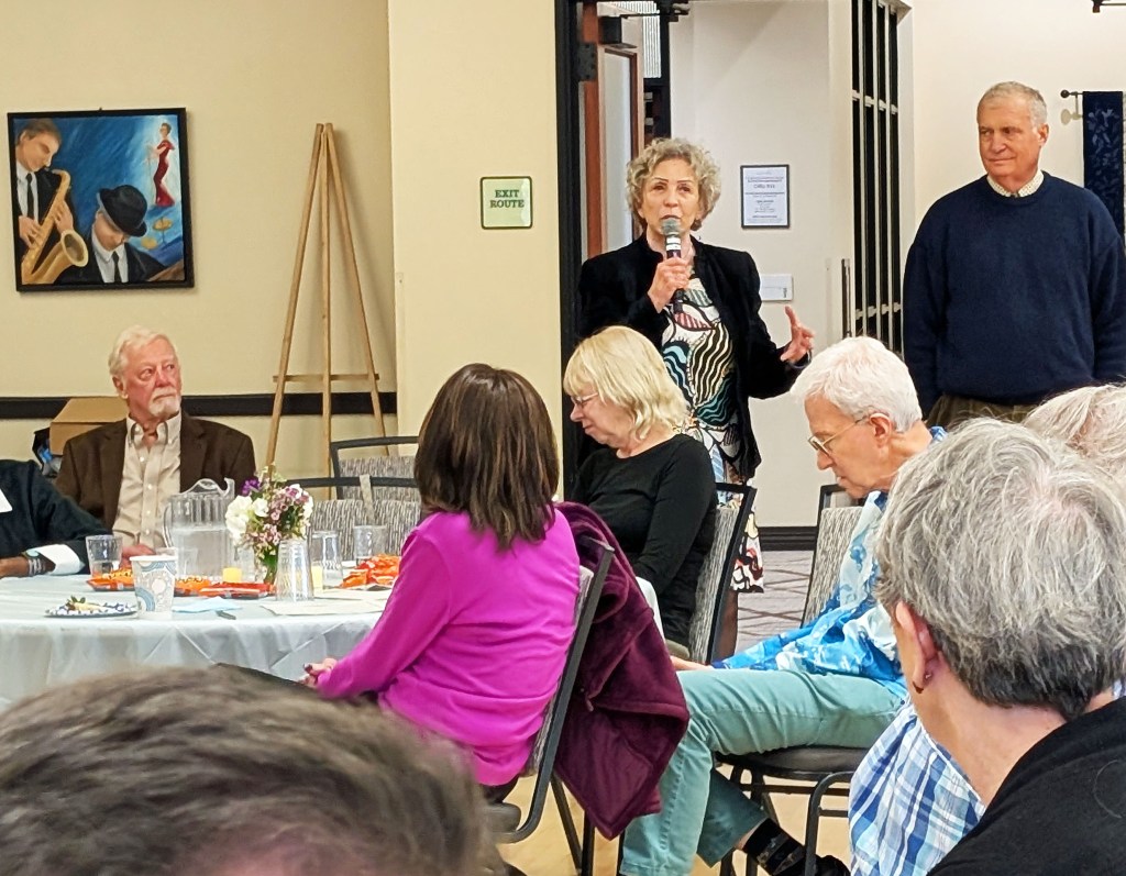 (Above, left) Joan Carman, wife of the late Steve Carman, recalled how Steve recruited Tom as his Vice President when he became the Video Club’s President in 2015. Over the next nine years, working together during Steve’s presidency, the two became close friends. Their legendary Tuesday luncheons were a favorite time to sort club issues.