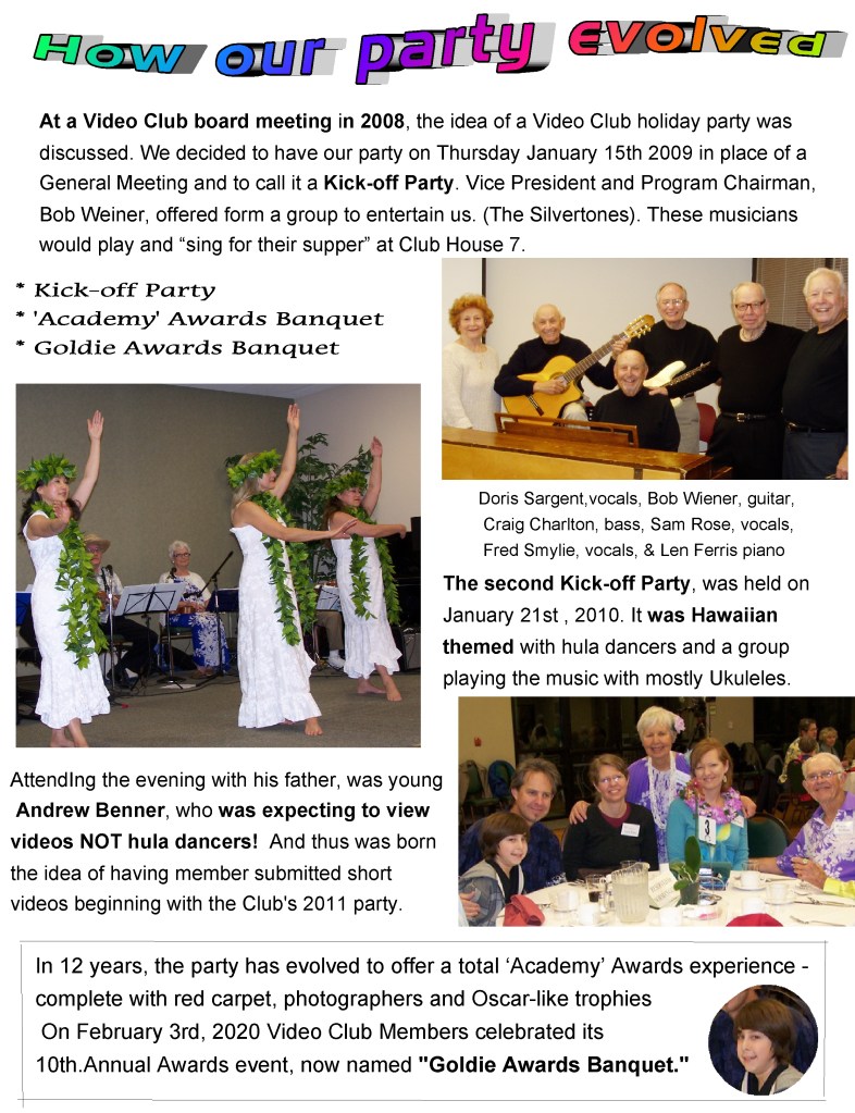 “Here’s an Idea! Since the purpose of the banquet is to complete and showcase the contest, why not put them in sync? In 2023, let’s judge the entries and honor the winners of our 13th Annual Short Video Contest.at our ā13th Annual Goldie Awards Banquet.ā It’s just a little white lie. Put it down to Covid. Or count the 2010 Hawaiian-themed party (described above) as our first banquet. After all, that’s where our contest idea was born.”